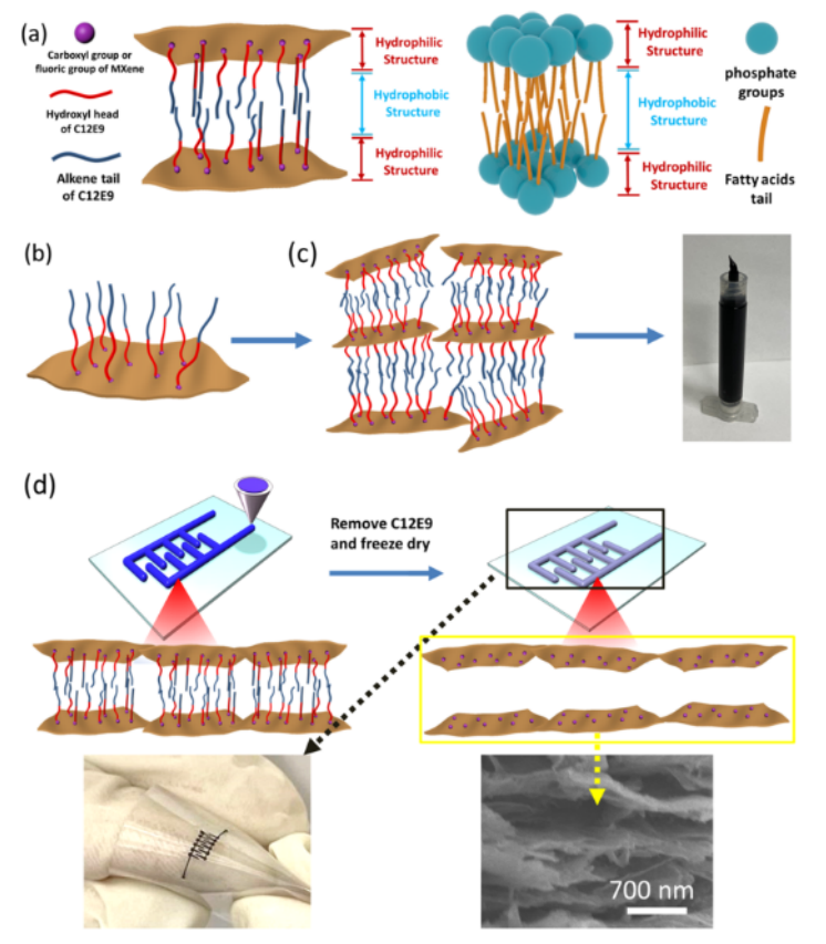 二維材料基水凝膠已廣泛應用于各種電子產品的擠出型3D打印油墨。但是,水凝膠油墨的粘度不夠高,無法維持自支撐結構而不發生建筑變形。使用低粘度水凝膠油墨也很難調整印刷設備的微觀結構。通過模擬細胞膜上的磷脂雙層,將兩親型表面活性劑非乙二醇單十二烷基醚(C12E9)加入到MXene水凝膠中。C12E9的加入提供了MXene薄片的兩親性,并產生了MXene薄片的3D互聯網絡。3D互聯網絡提供高粘度,均勻的鱗片分布,增強油墨的可打印性。這種油墨有利于MXene薄片在擠壓過程中的對齊,以及對齊的微孔和亞微孔結構的形成,從而提高了打印的微超級電容器的電化學性能。本研究為微電子學的可調諧微結構的制備提供了一個范例。