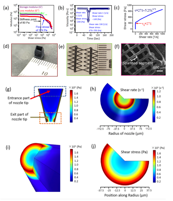 圖2. (a) MXene/C12E9油墨振蕩應變函數的存儲(G’)和損耗(G″)模量。(b)油墨粘度隨時間的變化。(c)擬合Herschel - Bulkley流體模型的MXene/C12E9油墨剪切應力與剪切速率的關系。(d和e) 3D打印的多層獨立建筑的數字照片插圖。(f)具有自支撐微米級層的3D MXene支架的SEM圖像。 (h)噴嘴尖端墨水的剪切速率分布及其半徑值。3D模型中墨(i)在噴嘴尖端內部和(j)在噴嘴尖端出口部分剪切應力分布的模擬結果。