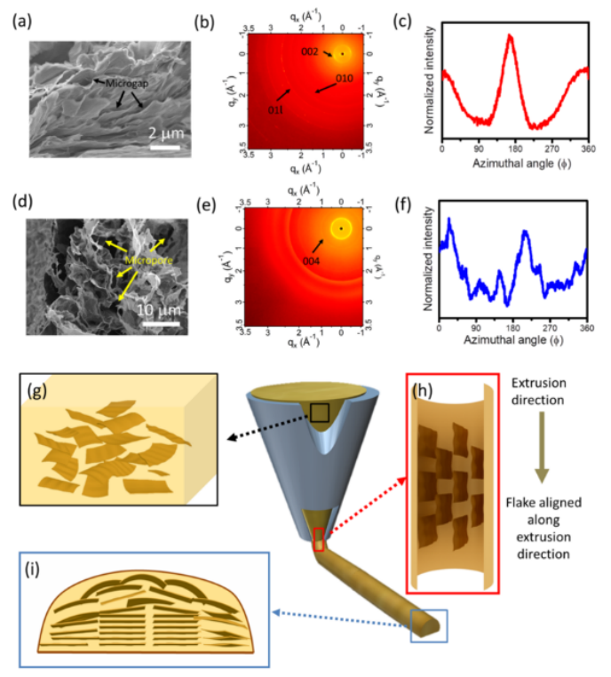 圖4. (a) SEM圖像,(b) 2D WAXS散射模式,和(c)在3D打印MXene/C12E9墨水產生的定向MXene薄片的區域內沿?方向±90°的(002)峰的標準化2D-WAXS方位強度分布。(d) SEM圖像,(e) 2D WAXS散射模式,和(f) 2D-WAXS方位強度分布沿?方向±90°隨機排列的MXene薄片由3D打印MXene水凝膠產生的區域。(g, h, i)擠出過程中MXene薄片在油墨內部的排列變化示意圖。