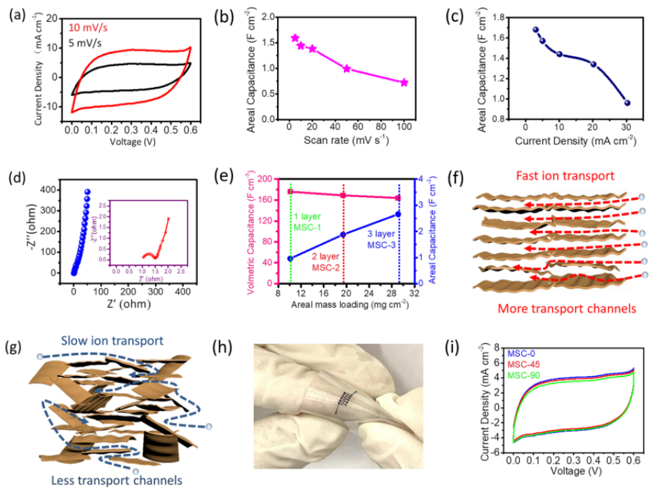 −1掃描速率下5個周期后的MSCs電化學阻抗譜數據。(e)多層MXene MSCs表現出與厚度無關的電容。(f和g) MXene電極內離子轉移路徑的示意圖,(f)排列的薄片和(g)隨機排列的薄片。(h)質量載荷為10.1 mg cm