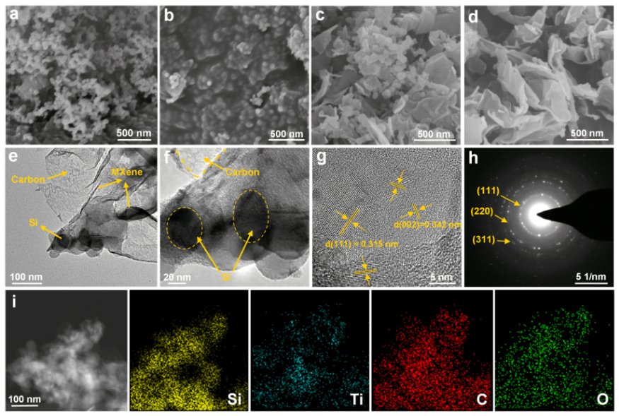 圖2. (a) Si、(b) Si@C、(c) Si/MXene和(d) Si/MXene@C的SEM圖像。Si/MXene@C的(e, f) TEM, (g) HRTEM, (h) SAED和(i) STEM圖像以及Si, Ti, C和O的相應(yīng)元素映射圖像。