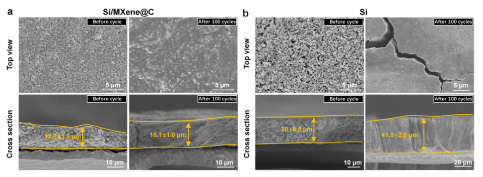 −1 100個(gè)循環(huán)之前和之后的俯視圖和橫斷面SEM圖像。