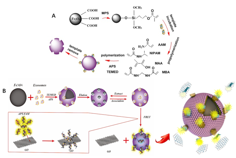 圖1. (A) 制備MIP的化學(xué)反應(yīng)演示;(B)實(shí)驗(yàn)原理詳細(xì)示意圖。