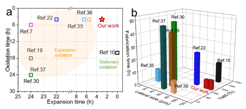 圖3. 一鍋法膨脹氧化的優(yōu)點(diǎn)。(a)用石墨薄片作為前驅(qū)體制備ULGO的不同方法的膨脹時(shí)間與氧化時(shí)間的關(guān)系。(b)不同方法的ULGO橫向尺寸、產(chǎn)率和制備時(shí)間的比較。