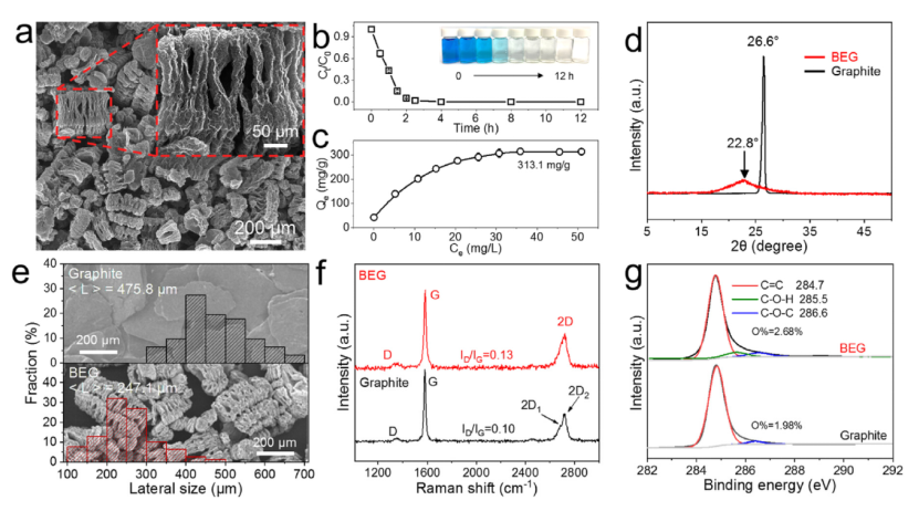 圖4. BEG的特征。(a, b, c) BEG的SEM圖像、吸附動(dòng)力學(xué)曲線和吸附等溫曲線。(d)石墨和BEG的XRD譜圖。(e)石墨薄片和BEG的橫向尺寸分布直方圖和SEM圖像。(f和g)石墨和BEG的拉曼光譜和XPS C 1s光譜。