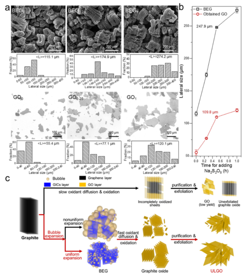 x和相應(yīng)GO樣本的SEM圖像和橫向尺寸分布直方圖。(b)通過(guò)調(diào)節(jié)添加過(guò)硫酸鹽的時(shí)間來(lái)改變BEG和相應(yīng)GO樣品的橫向尺寸。(c)石墨一鍋膨脹氧化法制備ULGO的示意圖。