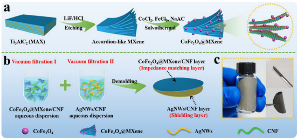 圖1  (a) CoFe2O4@MXene雜化和(b)非對稱層狀CoFe2O4@MXene/CNF- agnws /CNF復合膜的制備工藝。(c)具有靈活性的照片示意圖。