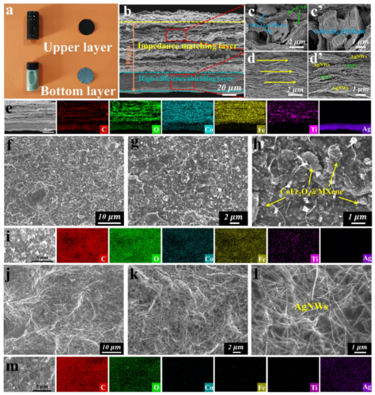 圖3 (a)上、下側面的數字照片,(b) L5的低倍掃描電鏡橫斷面圖像。(c, c’)上部和(d, d’)下部的高倍截面SEM圖像,(e) L5的截面元素映射圖。(f−h)上側面和(j−l)下側面的表面SEM圖像,(i)上側面和(m)下側面的表面EDS映射圖像。