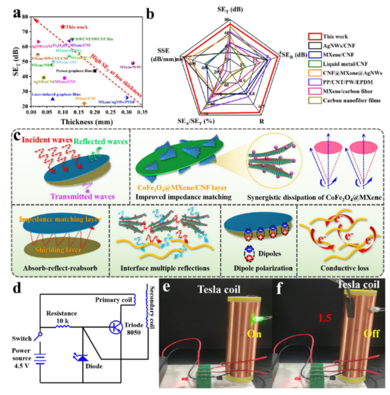 圖5。(a) SET與L5與既往報道的EMI屏蔽復合膜的厚度比較。(b) L5與其他報道的EMI屏蔽膜(包括SET、SER、R、SEA/SET和SSE)的綜合比較。(c)非對稱層狀復合膜的電磁屏蔽機理。(d)特斯拉線圈系統電路圖和特斯拉線圈系統在實際應用中的數字照片(e)沒有L5和(f)有L5。