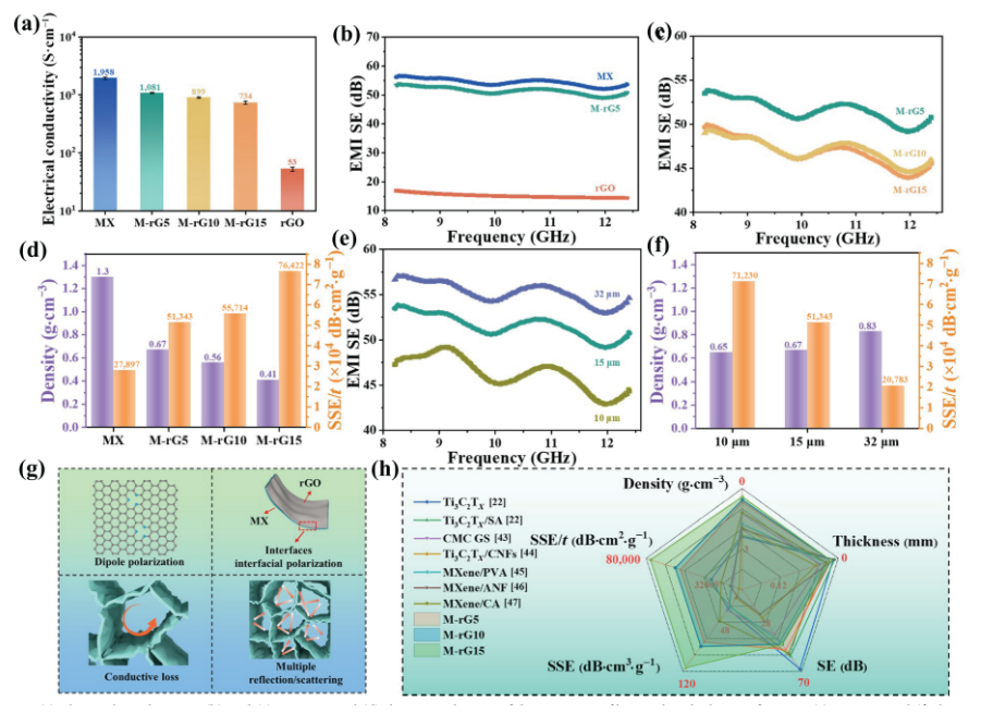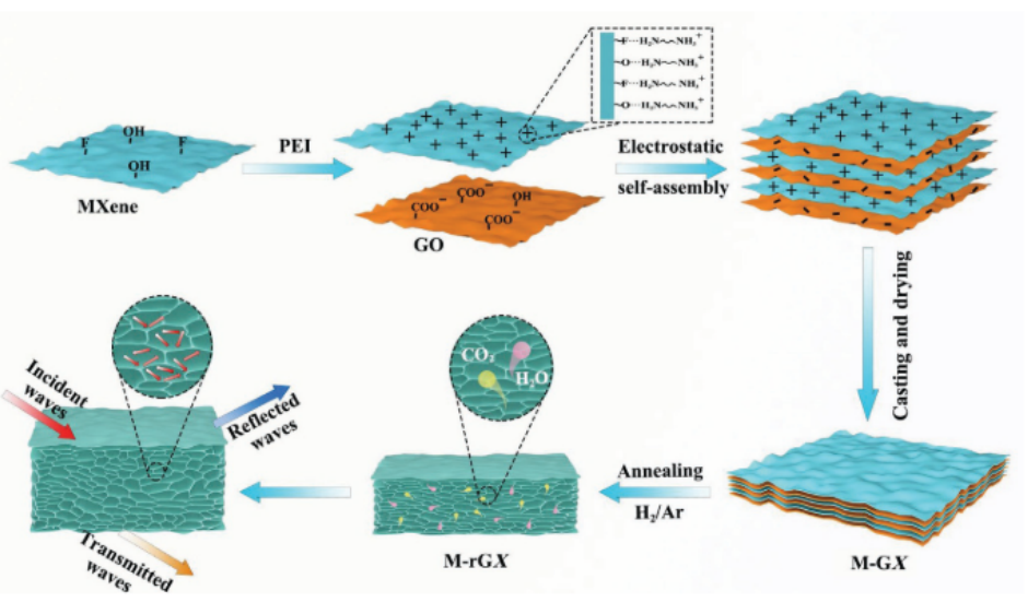 設(shè)計和制造高效的電磁干擾(EMI)屏蔽材料成為一個重要而緊迫的問題。因此,通過MXene與氧化石墨烯(GO)納米片之間的靜電自組裝,以及隨后在氫氬氣氣氛下的熱退火,我們成功地制備了一種新型的超薄、柔性和抗氧化的MXene基石墨烯(M-rGX)多孔膜。GO和MXene片層上官能團的快速分離誘導(dǎo)膜中形成多孔導(dǎo)電網(wǎng)絡(luò),從而有利于對入射電磁波的有效屏蔽。在厚度較薄的15 μm時,可獲得76422 dB cm