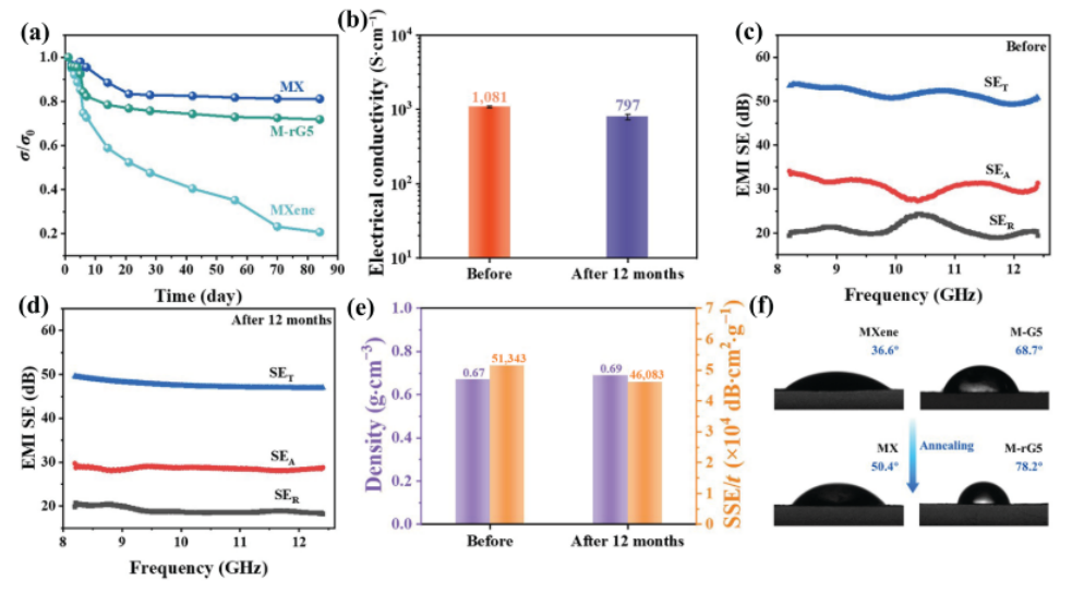 -1的最佳絕對屏蔽效果值。。更重要的是,MXene上官能團的有效去除顯著提高了膜的抗氧化性,使其具有優(yōu)異的EMI屏蔽性能耐久性(12個月)。