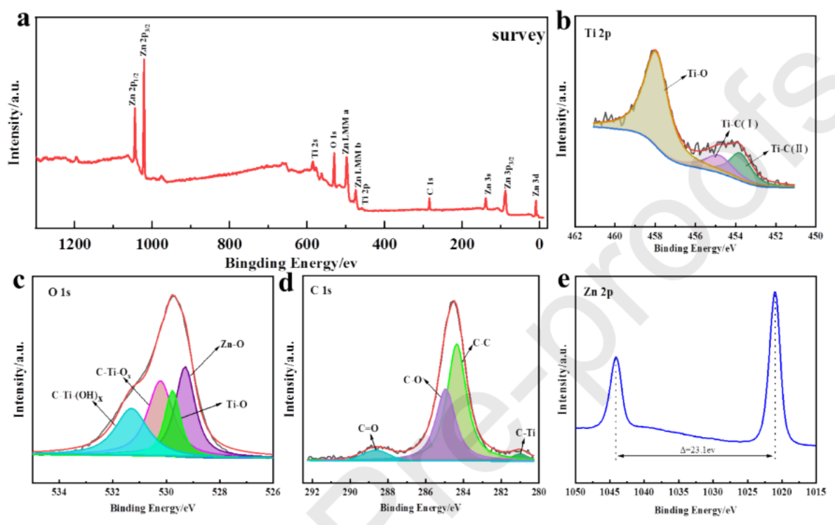 圖4. XPS譜圖,全XPS測量(a),Ti 2p (b), O 1s (c), c 1s (d)和Zn 2p (e)。