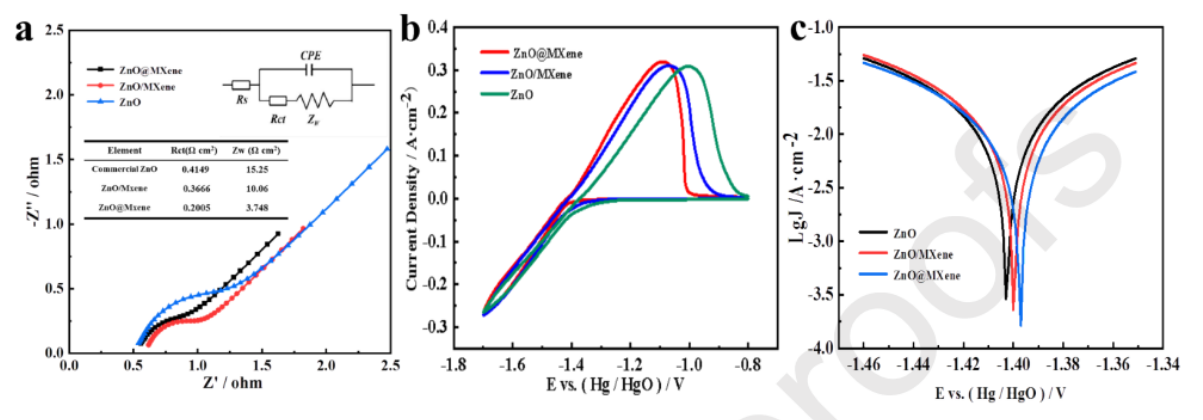 圖6 ZnO, ZnO/MXene和ZnO@MXene的EIS (a),循環伏安曲線(b), Tafel曲線(c)。