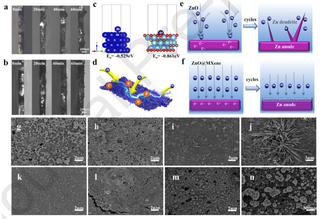 雖然鋅鎳電池是一種潛在的儲能系統,但陽極鋅電極往往面臨枝晶、鈍化和變形等問題,特別是在高電流密度下,這些問題往往會加劇,嚴重阻礙了其實際應用。為拓寬鋅堿性二次電池的應用領域,首先對氧化鋅進行了二維過渡金屬碳化物/氮化物(ZnO@MXene)改性。多種表征和密度泛函理論(DFT)計算證明,高導電的MXene基質提供了高速的電子傳遞通道,MXene的低離子擴散勢壘和優異的離子擴散遷移率可以迅速降低固-液界面的離子濃度梯度,從而減弱濃度極化。此外,MXene還可以調節擴散行為,通過鋅取向的o基團誘導鋅均勻沉積,形成分散良好的“籽點”,實現均勻成核,抑制枝晶生長。因此,ZnO@MXene作為鋅鎳電池的陽極,在10C條件下循環1500次后,仍能保持594mAh·g
