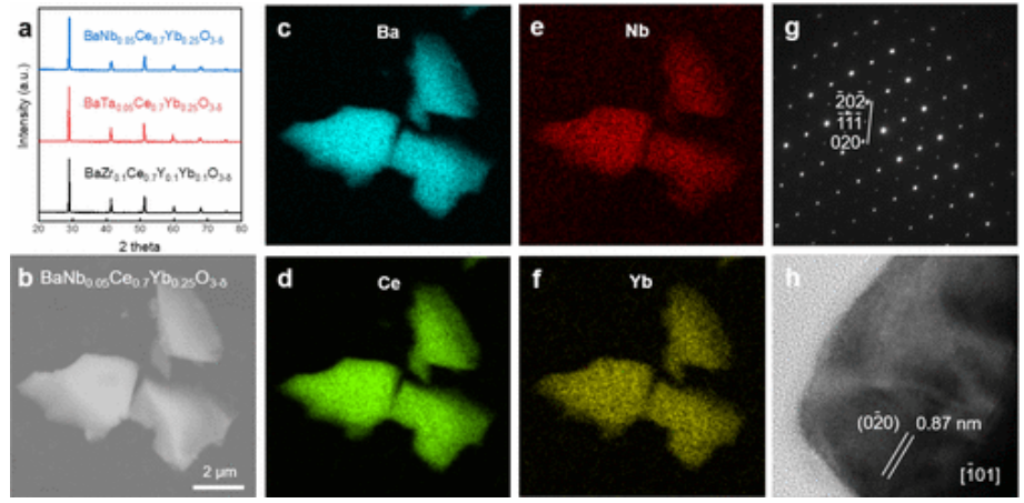 Figure 2. (a) BNCYb057025、BTCYb057025 和 BZCYYb1711 的 XRD 圖譜。(b) BNCYb057025 燒結(jié)粉末的 SEM 圖像。(c-f) 對(duì)應(yīng)元素的 EDS 映射。(g) BNCYb057025 沿 [1?01] 區(qū)軸與電子束平行對(duì)齊的 SAED 圖案。(h) HRTEM 圖像對(duì)應(yīng)于樣品的 [1?01] 區(qū)域軸。