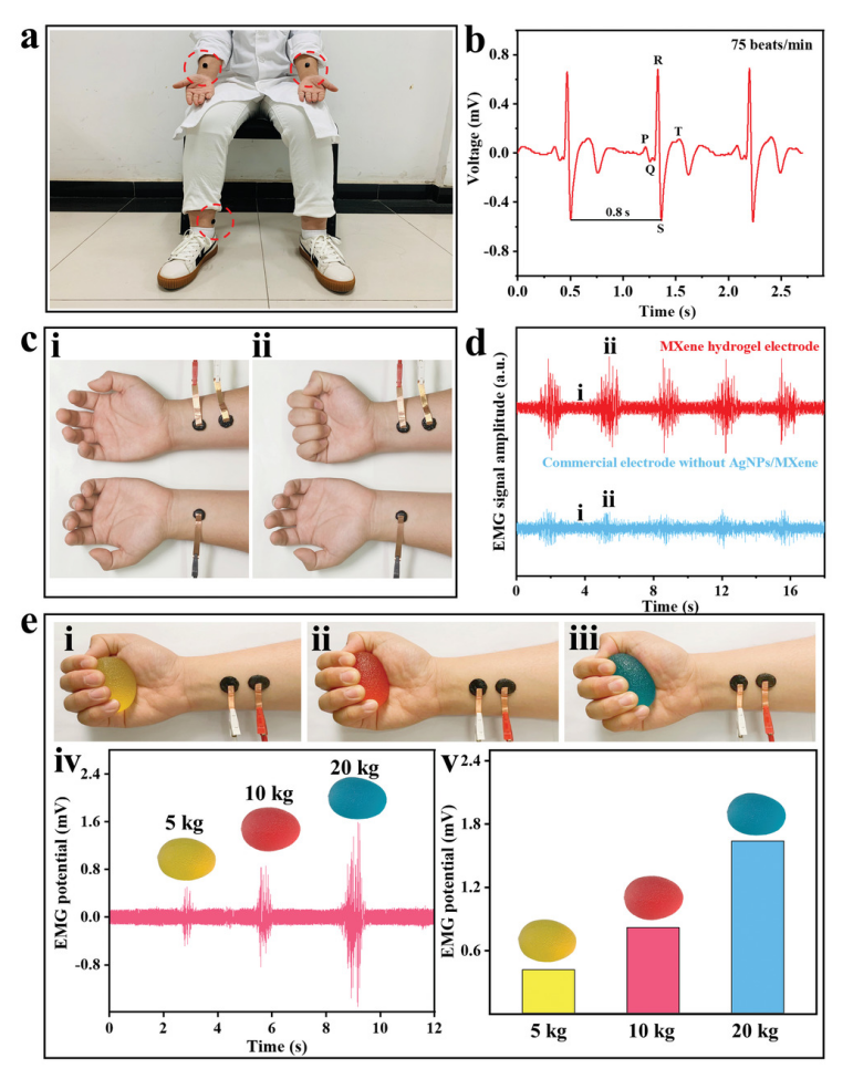 Figure 4. 由 MXene 水凝膠組裝而成的表皮傳感器,用于電生理信號檢測。a)心電圖檢測設置示意圖。b) 心電圖信號。c) EMG 檢測裝置示意圖。d) MXene 水凝膠電極和沒有 AgNPs/MXene 的商用水凝膠電極檢測到的 EMG 信號 i) 原始,ii) 右手握拳后)。e) i-iii) 在握住彈性球時監測前臂上的 EMG 信號。iv) EMG 信號,同時以不同的握力握住球。v) EMG 信號幅度隨夾持力的增加而變化。