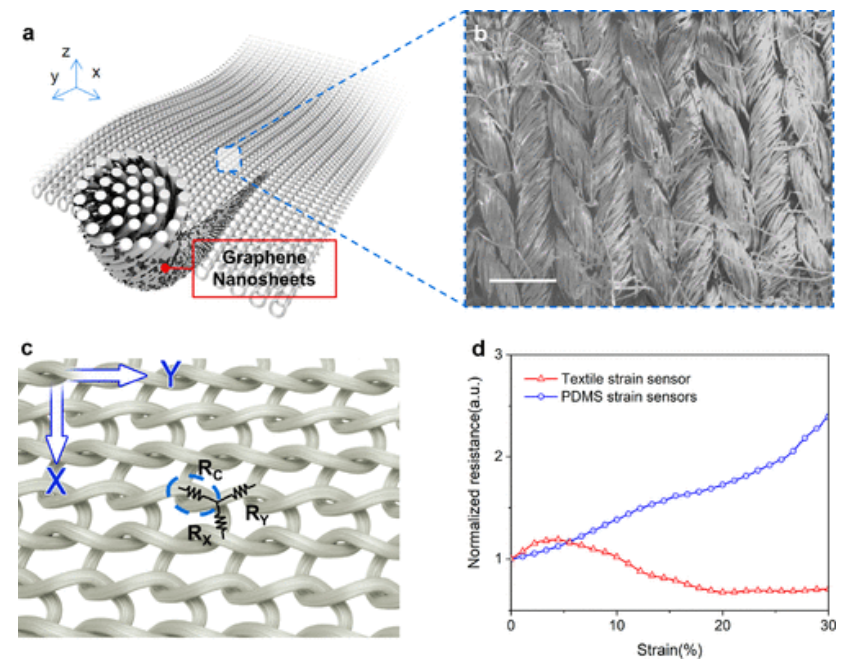 Figure 1. 石墨烯織物應變傳感器的形態組成和典型拉伸響應。(a) 典型緯編紡織品的示意圖。單纖維束在外部和內部都涂有石墨烯納米片。(b) 通過掃描電子顯微鏡觀察紡織品應變傳感器的表面形貌。比例尺代表 500μm。(c) 紡織品表面的示意性垂直視圖,注釋顯示纖維束細胞電阻的三個組成部分:X方向纖維束R x、Y方向纖維束R y和X - Y接觸部分,RC _. (d) 基于石墨烯的紡織應變傳感器的典型負微分電阻拉伸響應。相對應變為 0–30% 的紡織品傳感器不同于通常的正電阻變化傳感器。將傳感器的測量幅度標準化為初始值。
