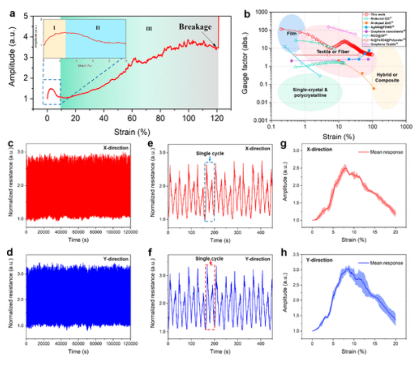 Figure 2. 基于石墨烯的紡織應變傳感器的性能。(a) 完整的抗拉響應,可分為三個階段,表現出廣泛的敏感性。(b) 不同機構張力傳感器的性能比較。(16−18,29−33)顏色塊代表基于石墨烯的傳感器的響應范圍。(c 和 d) 傳感器在X方向和Y方向的 3000 次拉伸載荷循環下的性能。(e 和 f)分別具有X方向和Y方向拉伸的放大循環。(g 和 h)5 個設備在 20% 相對應變下的歸一化平均響應和誤差條。