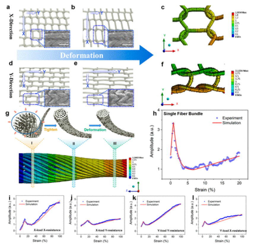 Figure 3. 紡織行為模型及拉伸模擬結果。(a和b)載荷應力下織物結構沿X方向變形的俯視圖。插圖比例尺,500μm。(c) 相鄰纖維束在X方向加載張力下的相對變形的機械模擬。(d和e)載荷應力下織物結構沿Y方向變形的俯視圖。插圖比例尺,500μm。(f) Y軸下相鄰纖維束相對變形的力學模擬-方向加載張力。(g) 橫向加載張力下單根纖維束相對變形的力學模擬。(h) 單根纖維束和模型擬合的拉伸試驗。由于單根纖維束的拉伸余量較小,當相對應變達到25.38%時纖維束完全斷裂。(i-l) 分別為X負載X電阻、X負載Y電阻、Y負載Y電阻和Y負載X電阻的拉伸響應。