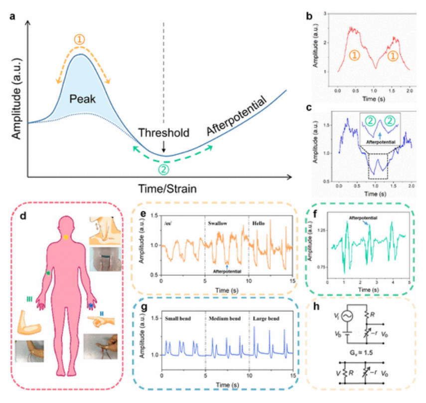 Figure 4. 紡織應變傳感器的應用場景。(a) 拉伸響應的說明。在初始狀態下,外部應變刺激形成一個由階段 I 和 II 組成的峰值 (φ)。當應變超過閾值 (κ) 時,將出現一個后電位峰值。整個反應具有類似神經尖峰的波形,如插圖所示。(b) 在低于閾值的應變下的循環響應。(c) 在高于閾值的應變下的循環響應。(d) 實驗部署地點概覽。(e-g) 分別在喉部、肘部和手指關節處測量的波形。可以看出,紡織傳感器在實際應用中對不同的應變敏感。(h) 近傳感器信號放大器示意圖。具有負微分電阻的基于石墨烯的紡織應變傳感器 -r和具有正電阻變化R的基于石墨烯的 PDMS 應變傳感器可以由交流信號放大器組成。