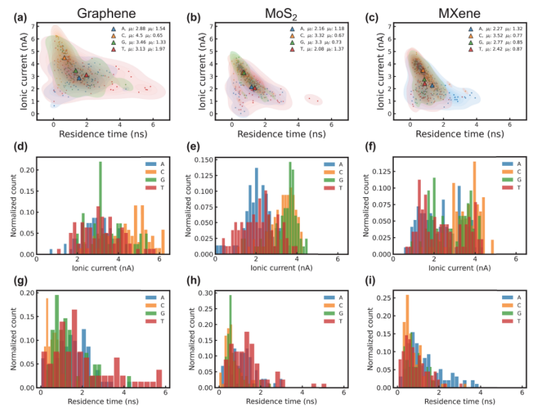 2和 MXene 納米孔時,所有四種 DNA 堿基的離子電流(d-f)和停留時間(g-i)的直方圖。
