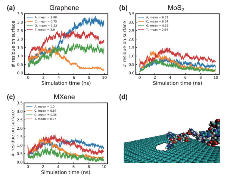 圖3、(a-c)在10ns 的模擬過程中,DNA 堿基的平均數量分別吸附在石墨烯、 MoS