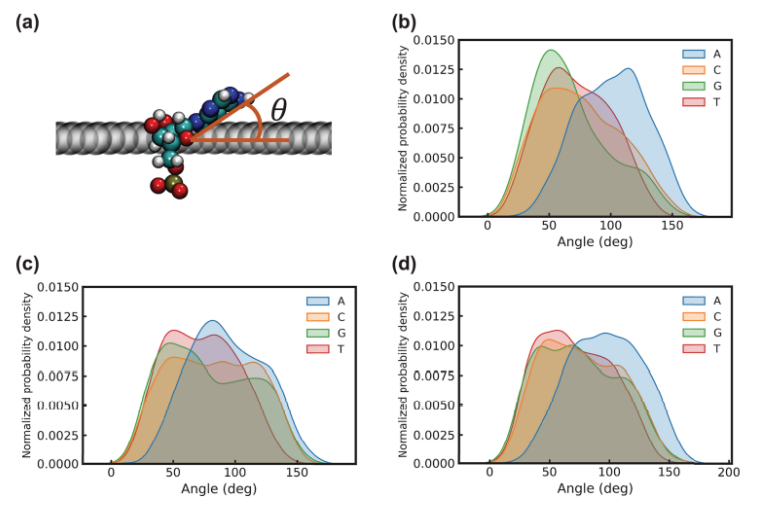 圖4、(a)每個 DNA 堿基的平面定義為包含該堿基的芳香環的平面。DNA 堿基和膜之間的傾斜角 θ 是 DNA 平面和膜平面之間的角度。(b-d)分別位于石墨烯、二硫化鉬和多氯聯苯納米孔內的 DNA 堿基與孔之間傾斜角的核密度估計圖。KDE 圖顯示了傾斜角的平滑概率密度。將每條概率密度曲線歸一化,使得曲線下面的面積(積分)等于1。