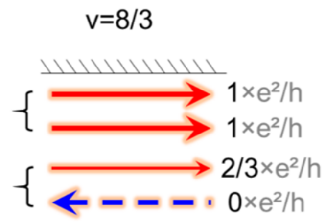 量子霍爾效應的ν=8/3態的邊緣結構。紅色粗箭頭表示兩種帶整數電荷的邊緣模式,紅色細箭頭表示帶小數電荷的邊緣模式,藍色虛線箭頭表示中性模式。每種模式的電導率在右側給出。