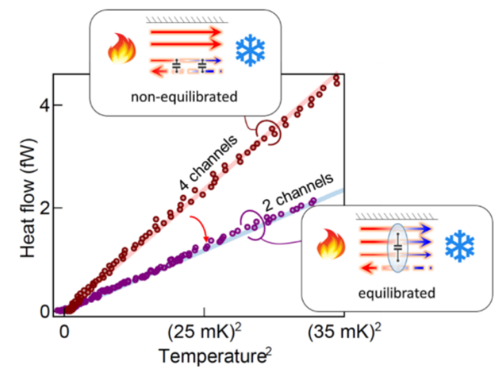 在 ν=8/3 時作為溫度的函數測量的量化熱流。非平衡情況顯示為深紅色圓圈,平衡情況顯示為紫色圓圈。直線是4通道和2通道量化熱流的理論預測。這兩幅漫畫說明了邊緣模式之間的耦合。