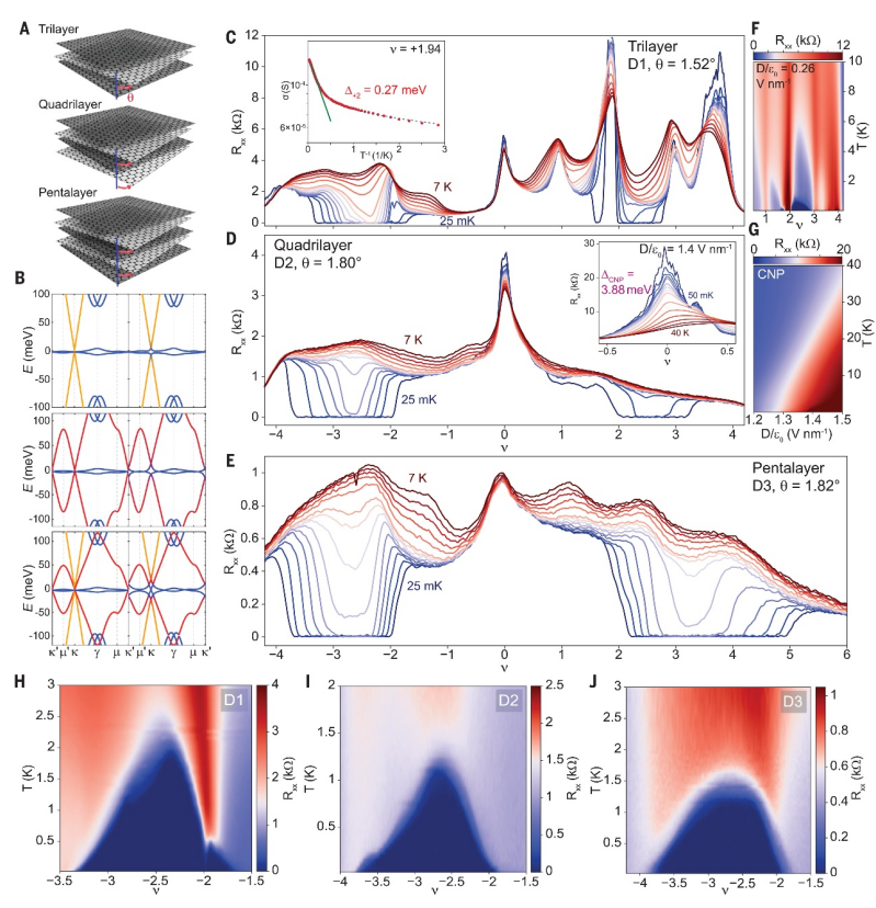 Figure 1. 交變扭曲石墨烯多層膜中的超導(dǎo)性和關(guān)聯(lián)絕緣體。(A) 交替扭曲石墨烯多層膜的示意圖,其中每個連續(xù)層以交替順序相對于前一層扭曲±θ的角度。