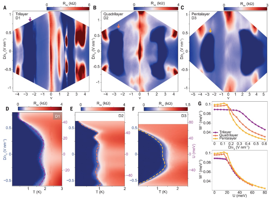 Figure 4. TPG中擴展的超導(dǎo)pockets。(A) 扭曲五層石墨烯的Rxx與ν和零D場溫度的關(guān)系。(B) Rxx與D/ε0=0:17、0:32和0:44 Vnm