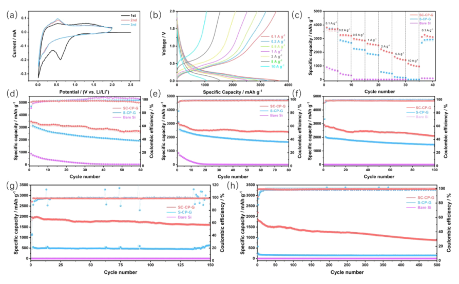 -1的各種電流密度下循環(huán)的恒電流充放電曲線。(c)SC-CP-G、S-CP-G和裸Si的速率性能。(d h)SC-CP-G、S-CP-G和裸硅電極在(d) 0.2、(e) 0.5、(f) 1、(g) 2和(h)5 Ag