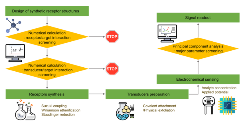 圖1. 用于高選擇性殺菌劑檢測的新型 CRs 和石墨烯納米傳感器的設(shè)計、篩選和合成/制備工藝流程。