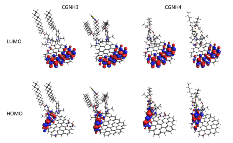 圖4. 在B3LYP/6-31G(d)水平上計算了OIT存在和不存在時CGNH模型(以CGNH3和CGNH4模型為代表)的前線分子軌道。