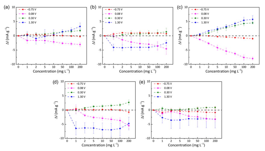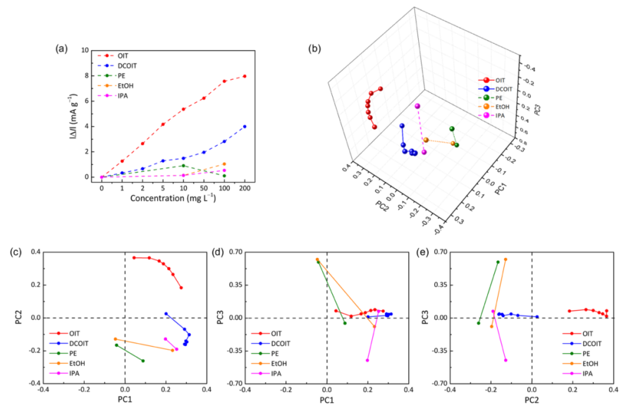 3)下測量的OIT濃度的函數(shù)的電流變化(δI)的代表性曲線圖。(b e)CGNHs響應(yīng)的PCA圖,其中在不同濃度和電位下測量δI值;相同化學(xué)物質(zhì)的得分點由一條線按照濃度順序連接起來(目標(biāo)濃度為1-200mg L