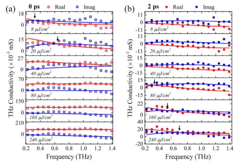 圖4. 分別在(a) 0 ps(空心)和(b) 2 ps(實心)的延遲時間下,P/G異質(zhì)結(jié)構(gòu)在1300 nm激發(fā)下的光致電導(dǎo)率的DS模型擬合(圓圈和正方形分別表示THz電導(dǎo)率的實部和虛部;實線表示復(fù)電導(dǎo)率的DS模型擬合曲線;箭頭表示散射率γs。