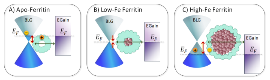 圖5.BLG(藍灰色雙錐)和(A) apo-AfFtn-AA,(B)具有小氧化鐵的AfFtn-AA,和(C)大氧化鐵核之間的能量排列示意圖。頂部偏置觸點(紫色)顯示為無外部偏置。垂直方向表示電子的能量,水平方向通常表示垂直于結的距離,除了BLG雙錐表示其關于動量的能量分散。水平綠色箭頭表示相干隧穿,垂直紅色箭頭表示能壘(ε