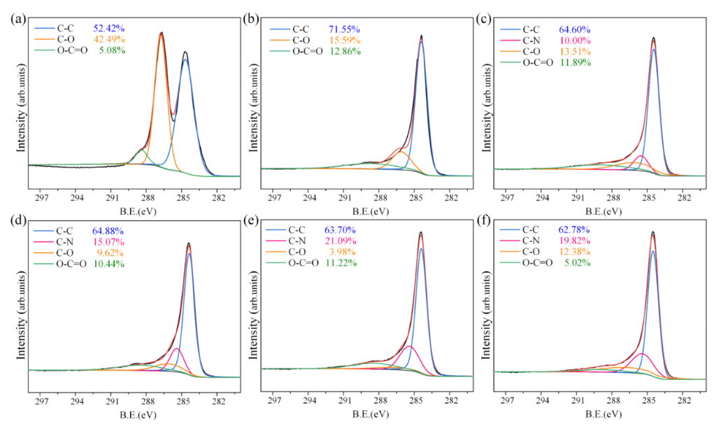 圖4. (a) GO, (b) CF-0, (C) CF-5, (d) CF-10, (e) CF-15和(f) CF-20的C 1s XPS譜。