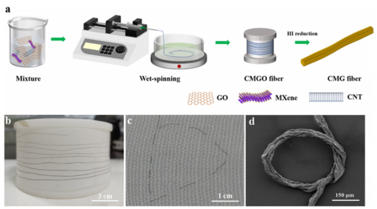 圖1 (a) CMG纖維的制作工藝示意圖。(b)收集的CMG纖維的數(shù)字照片。(c)用CMG纖維刺繡的字母“D”的數(shù)碼照片。(d) CMG纖維結的掃描電子顯微鏡(SEM)圖像。