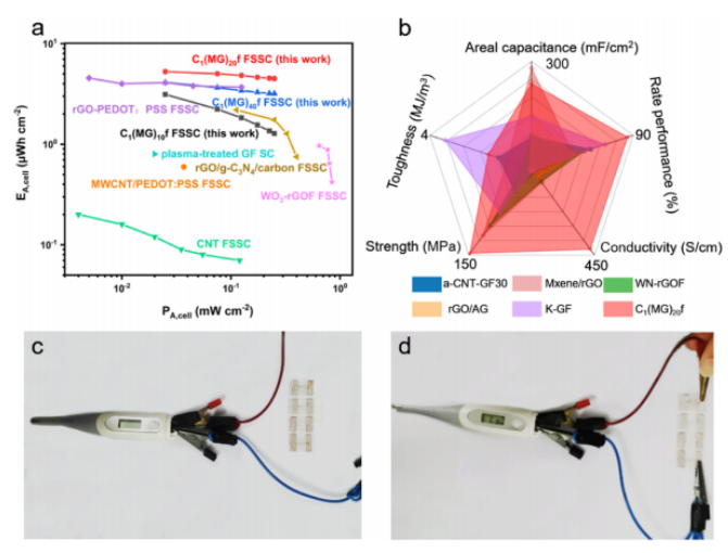 圖5。(a) CMG FSSCs和其他已報道的碳基固態(tài)FSSCs的Ragone圖。(b) C1(MG)