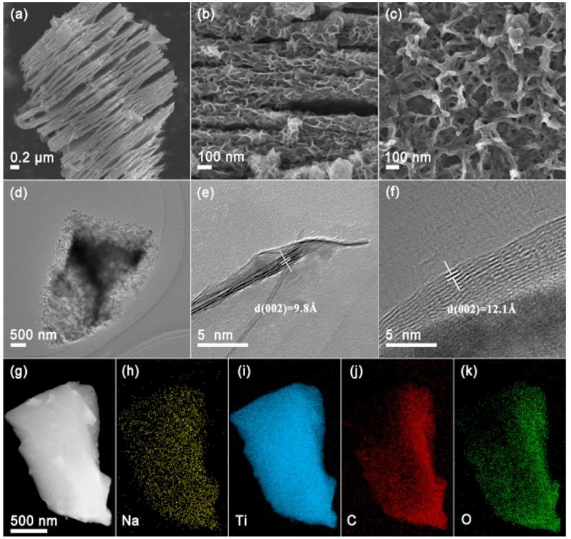 圖2. (a) Ti3C2Tx MXene的SEM圖像。(b,c) NTO@MXene復(fù)合材料的側(cè)視圖和俯視圖SEM圖像和(d)NTO@MXene合成物的TEM圖像。(e,f) Ti3C2Tx的高分辨率透射電子顯微鏡(HRTEM)圖像MXene和NTO@MXene復(fù)合。(g−k) NTO@MXene的TEM和元素(Na, Ti, C, O)映射圖像。