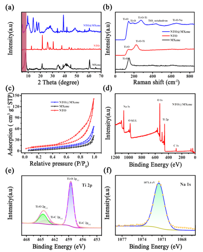 圖3 (a) NTO@MXene復(fù)合材料、MXene和NTO的XRD圖案。(b) NTO@MXene復(fù)合材料、MXene和NTO的拉曼光譜。(c) NTO@MXene復(fù)合材料、MXene和NTO的氮吸附-解吸等溫線。(d) NTO@ MXene復(fù)合材料的全XPS光譜。(e) Ti 2p和(f) Na 1s NTO@MXene的XPS光譜。