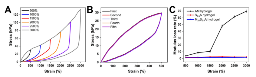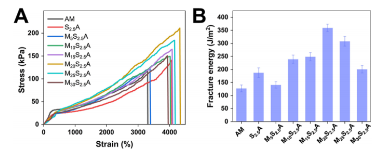 柔性傳感器需要良好的拉伸性能、柔韌性和足夠的靈敏度來監測和傳輸運動中的微妙應變變化。本文通過將丙烯酰胺(AM)、Ti3C2Tx MXene納米片和海藻酸鈉(SA)聚合,合成了MXene-海藻酸鈉-丙烯酰胺(MSA)復合水凝膠。掃描電鏡、能譜和元素映射顯示Ti3C2Tx MXene納米片在復合水凝膠體系中均勻分散。傅里葉變換紅外光譜和差示掃描量熱分析驗證了Ti3C2Tx MXene納米片和SA - AM聚合物之間的強氫鍵作用。制備的M20S2.5A水凝膠的極限拉伸應變為4350%,斷裂能高達359.51 J m