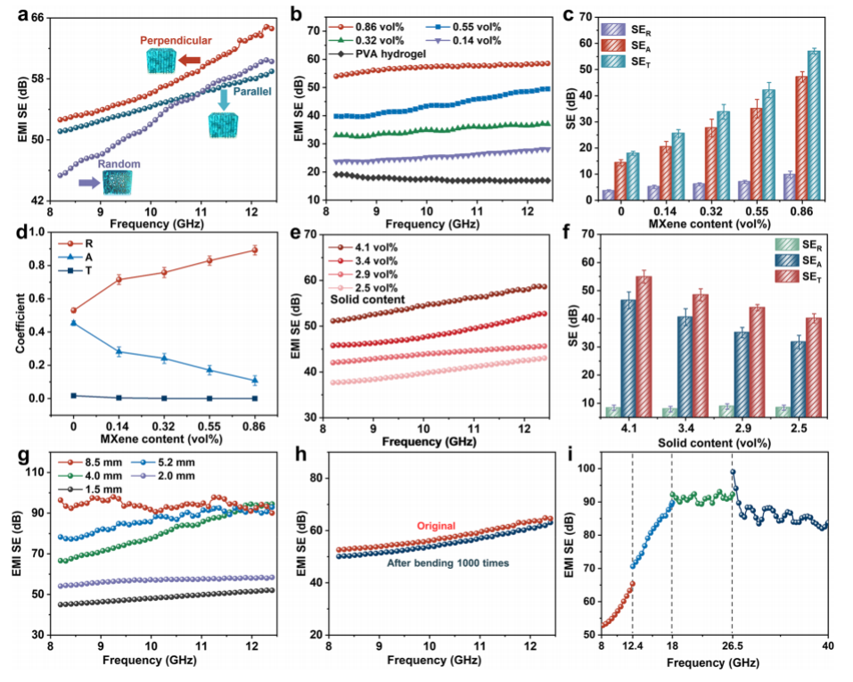 圖2. (a)不同孔隙形態的0.86 vol % MXene/PVA水凝膠的x波段EMI SE。(b) x波段EMI SE和(c) SER、SEA和SET。(d)不同MXene含量水凝膠的功率系數。(e) EMI SE和(f)不同固體含量(MXene和PVA的體積分數)0.86 vol % MXene/PVA水凝膠的SER、SEA和SET。(g)樣品厚度對0.86 vol % MXene/PVA水凝膠EMI SE的影響。(h) MXene/PVA (0.86 vol %)水凝膠在1000次彎曲處理前后的x波段EMI SE。(i) X、Ku、K和Ka頻帶等典型GHz頻率范圍內的EMI SE。