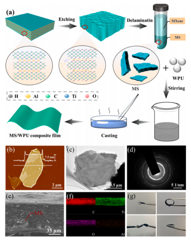 圖1 (a) MS/的制造過程示意圖分子量復合薄膜。(b) MS片的AFM圖像。(c) MS的TEM圖(d) MS的衍射圖(e) MS/WPU復合膜的截面SEM圖。(f) C, Ti, O, Al元素MS/WPU復合薄膜的EDS映射圖像。(g)顯示超柔性性能的獨立MS/WPU復合薄膜照片。