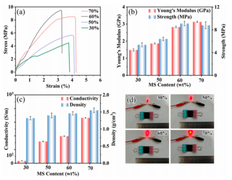 圖2. (a)在WPU中使用不同數量MS制成的薄膜的拉伸應力-應變曲線。(b)相應的楊氏模量和抗拉強度。(c) MS基復合材料的導電性。(d)在3.0 V電壓下點亮LED燈的MS/WPU復合薄膜的各種MS含量的照片。