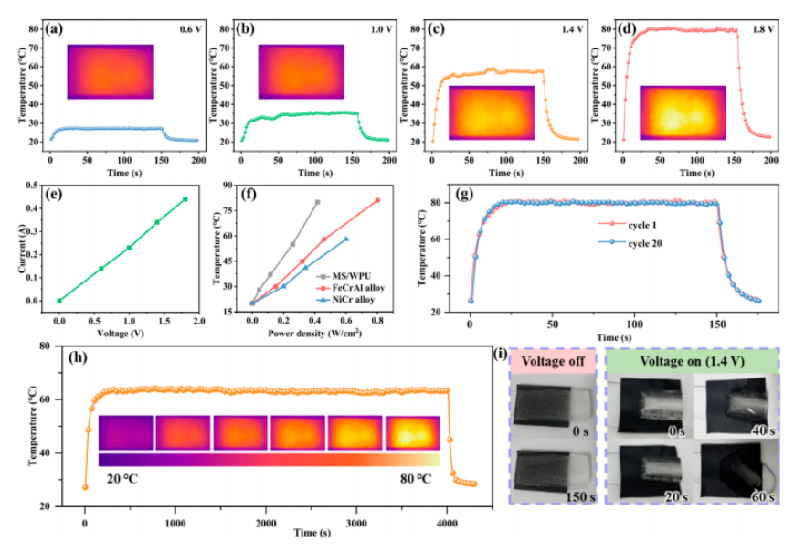 圖5 70 wt % MS/WPU復合薄膜在(a) 0.6 V, (b) 1.0 V, (c) 1.4 V和(d) 1.8 V電壓下的電熱響應。(e) 70 wt % MS/WPU復合膜的I−V曲線。(f)典型商用金屬合金和由70 wt % MS/WPU制成的復合膜的平衡溫度與輸入功率密度曲線。(g) 70 wt % MS/WPU復合薄膜在1.8 V的穩定電壓下在各種加熱/冷卻循環中的溫度穩定性。(h) 70 wt % MS/WPU復合膜在1.4 V恒定電壓下長時間的電熱曲線。(i)在施加1.4 V電壓下使用70 wt % MS/WPU復合膜進行除冰試驗。
