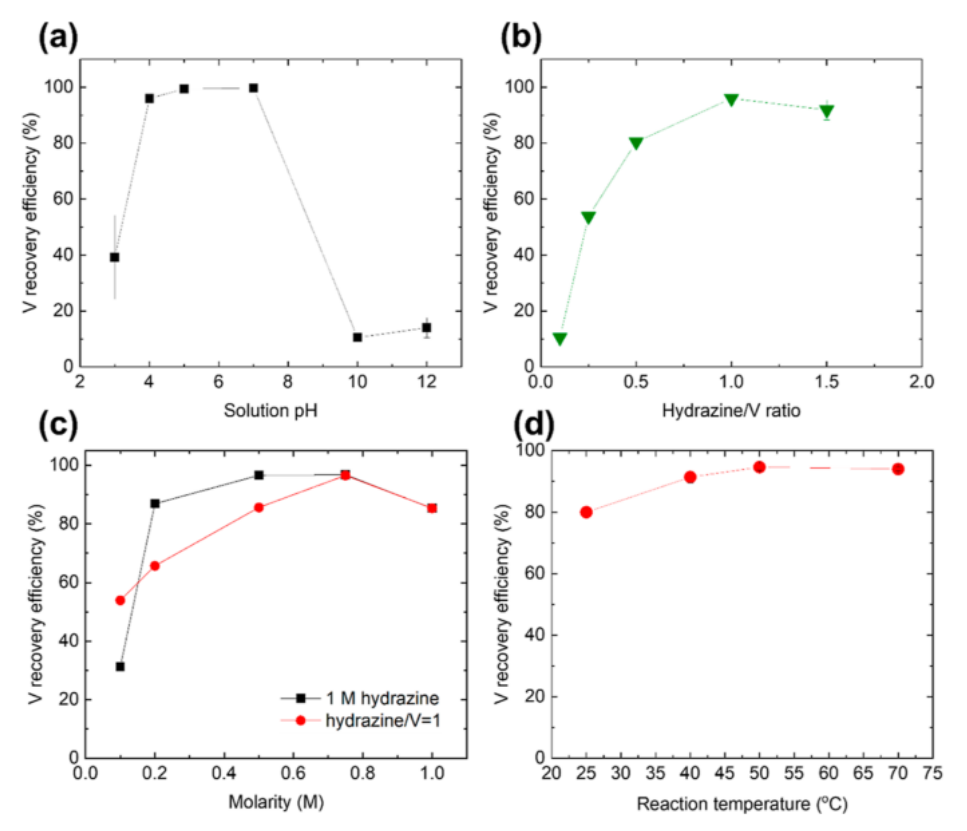 圖 3. pH (a)、肼/V 比 (b)、初始 V 濃度 (c) 和反應(yīng)溫度 (d) 對 V 回收效率的影響。