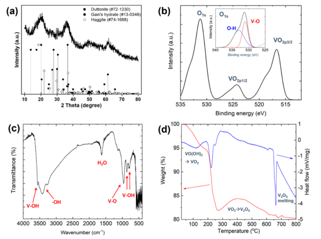 圖 5. 在 pH 4 下回收的 V 化合物的 XRD 光譜 (a)、XPS 光譜 (b)、FTIR 光譜 (c) 和 TGA-DTA 數(shù)據(jù) (d)。(b) 的插圖顯示了 O 1s 的解卷積 XPS 光譜 核心層面。