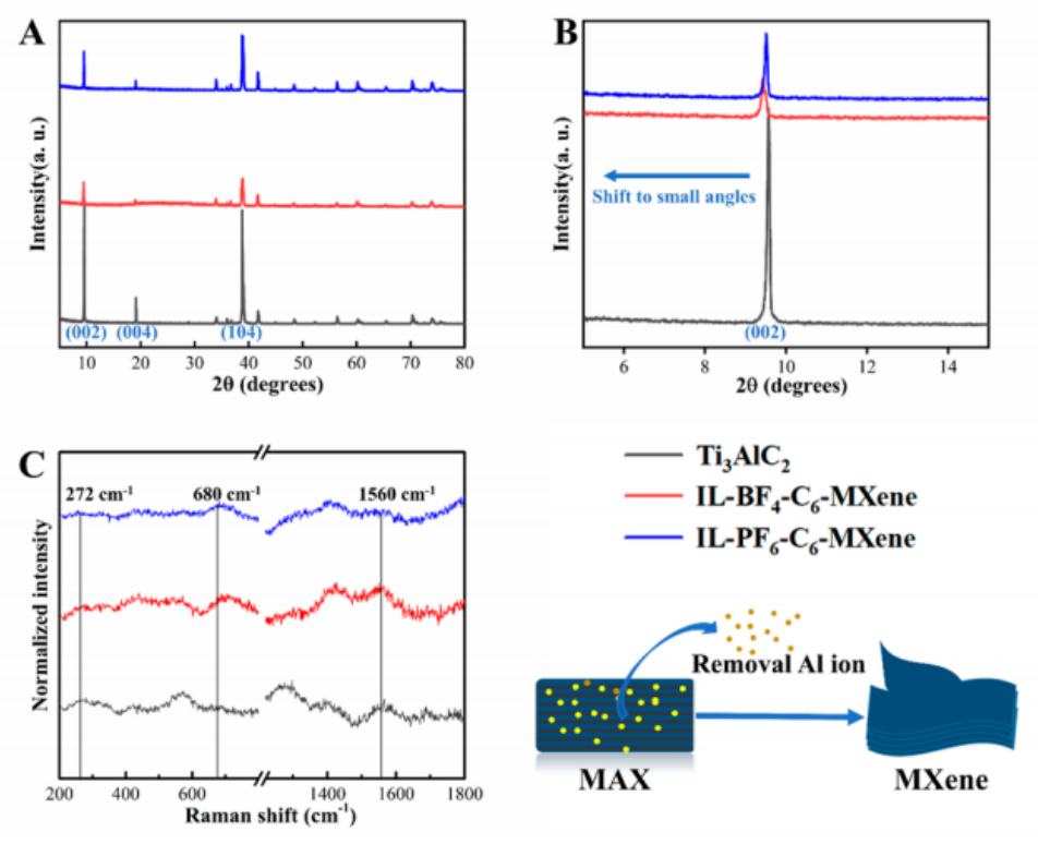 圖1 分別利用IL-PF6-C6-Ms和IL-BF4-C6-Ms (pH為0.3,溫度為30℃)開發MXenes的XRD圖譜和(C)拉曼光譜。